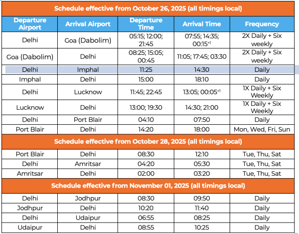 The airline will operate direct services from Delhi to Goa (Dabolim), Imphal, Lucknow, and Port Blair (Sri Vijaya Puram), followed by Amritsar on 28 October 2025, and the introduction of new routes to Jodhpur and Udaipur from 1 November 2025.