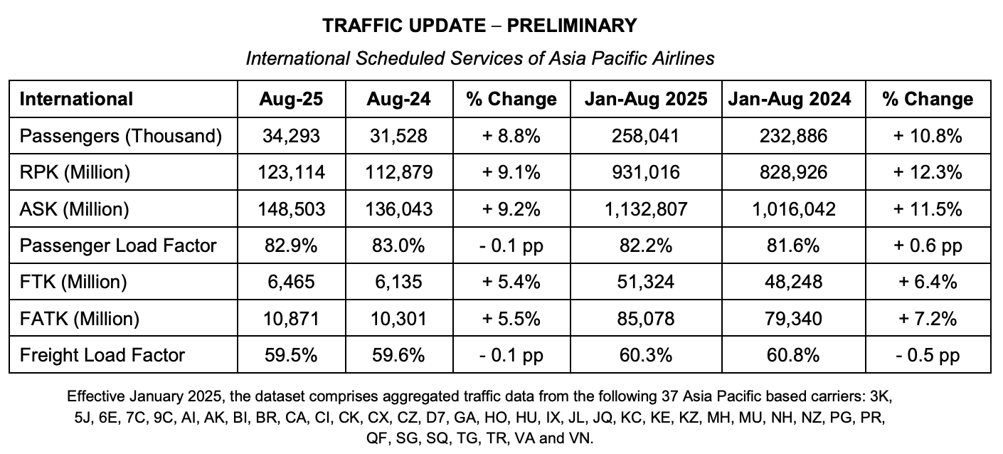 KUALA LUMPUR, 1 October 2025: Preliminary August 2025 traffic figures released Tuesday by the Association of Asia Pacific Airlines (AAPA) show continued growth in international passenger demand, on the back of strong business and leisure travel activity across the region and globally.