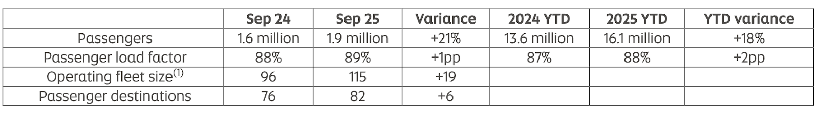 Passenger load factor averaged 89% across the month, up one percentage point from September last year, demonstrating efficient use of added capacity.
