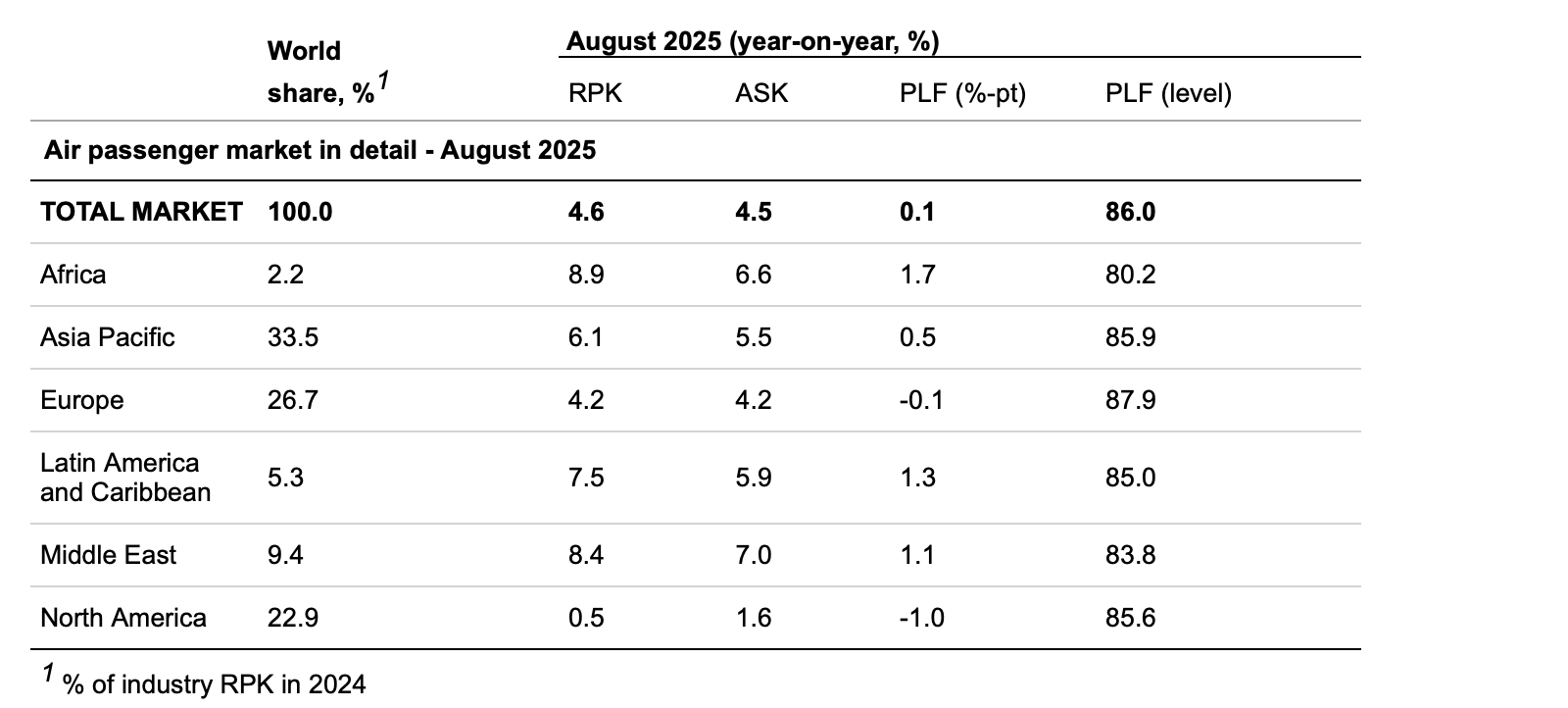 Total demand, measured in revenue passenger kilometres (RPK), was up 4.6% compared to August 2024. Total capacity, measured in available seat kilometres (ASK), was up 4.5% year-on-year. The August load factor was 86% (+0.1 ppt compared to August 2024), a record high for the month.