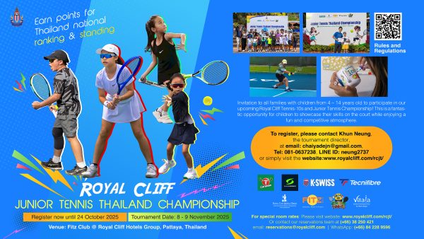 The event organiser, Royal Cliff, invites young tennis enthusiasts aged 4 to 14 years, of every skill level, to join this exciting tournament. It’s the perfect chance to meet fellow players, improve your game, and gain valuable competitive experience. Participants will also have the opportunity to earn points towards their national ranking in Thailand.