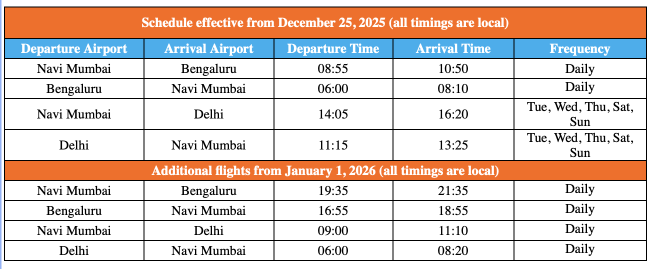 Starting 25 December 2025, the first day of commercial operations at the airport, Air India Express will operate daily flights to Bengaluru and five weekly flights to Delhi, the airline’s two largest domestic hubs.