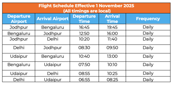 DELHI, 3 November 2025: Air India Express has expanded its footprint in Rajasthan state with four new daily flights connecting Jodhpur and Udaipur to Bengaluru and Delhi, starting 1 November.