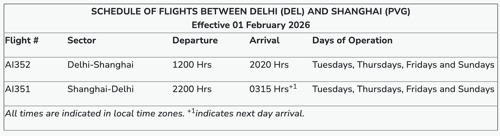 DELHI, 19 November 2025: Air India confirmed on Monday the resumption of direct flights between Delhi and Shanghai (PVG), starting 1 February 2026.