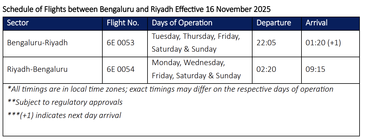 “As Saudi Arabia’s capital and a key hub for trade and investment, Riyadh is significant for IndiGo to strengthen air connectivity with India. This new route from Bengaluru marks IndiGo’s fourth non-stop connection to Riyadh, after Delhi, Mumbai, and Hyderabad,” said IndiGo Head of Sales, Vinay Malhotra. “It will enhance accessibility for business and workforce from the region while reinforcing IndiGo’s growing network across Saudi Arabia and the Middle East.”