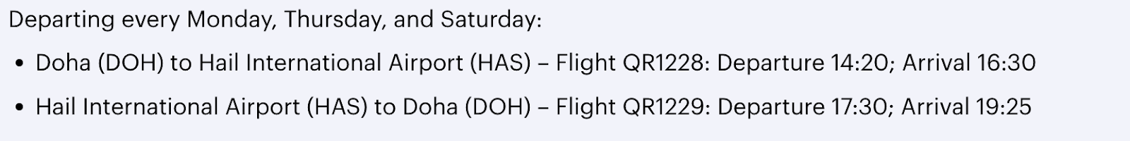 From 5 January 2026, Qatar Airways will launch three weekly flights to Hail (HAS), making it the 13th Saudi city to be served by the airline in addition to increasing services to Jeddah (JED) and Riyadh (RUH) from six to seven daily flights.