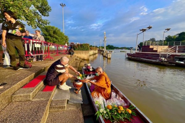 A monk soon glided towards us in a small wooden boat, the bow dipping quietly with each stroke. One by one, we stepped forward to offer our gifts, placing our hands together in a respectful wai. The river shimmered with early light, giving the moment a peaceful, almost timeless quality.