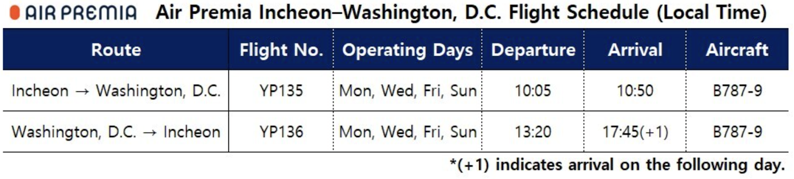 SEOUL, 15 December 2025: Air Premia, South Korea’s hybrid airline, announced last week its plan to launch four weekly scheduled flights on the Incheon (ICN)–Washington Dulles (IAD) route starting 24 April 2026.