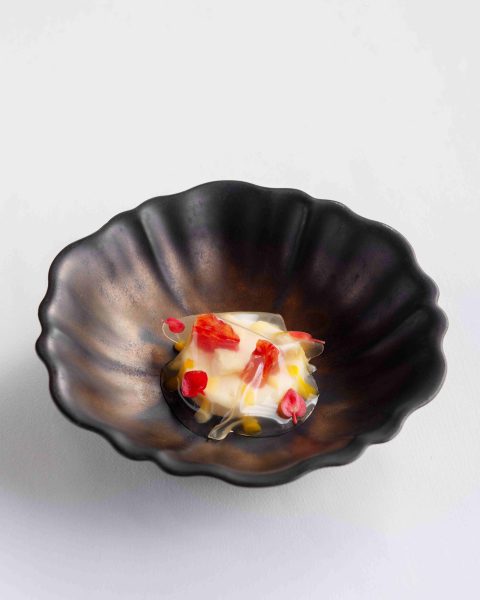 Cannubi by Umberto Bombana’s design plays an equal role in shaping the dining experience. Situated on the lobby level of the reimagined Dusit Thani Bangkok, the two-level space looks out over the hotel’s dramatic nine-storey waterfall. Inside, the main dining room is crowned with intricately carved golden teakwood panels preserved and meticulously restored from the original hotel’s Benjarong restaurant. These heritage teak elements, combined with flowing lines and atmospheric lighting, create a warmly intimate setting, complemented by private dining rooms accommodating six and twelve guests.