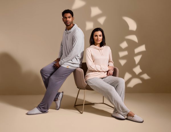 The women’s set is presented in soft blush pink and light grey, while the men’s design has a sophisticated two-tone grey palette. Matching slippers and eye masks complete the ensemble. Slippers feature a plush inner sole for added comfort, while the eye mask is lined with ultra-soft silk to promote uninterrupted rest.