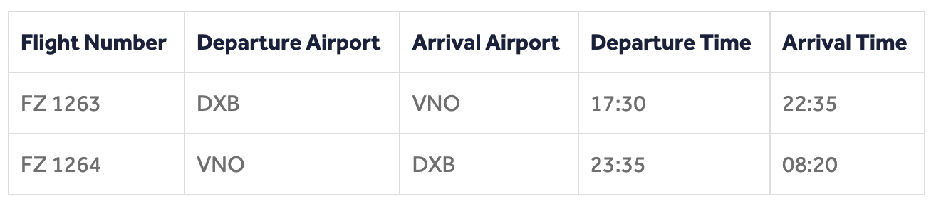 Return Business Class fares from DXB to VNO start from AED7,505, and Economy Class Lite fares start from AED2,225. Return Business Class fares from VNO to DXB start from EUR1,440, and Economy Class Lite fares start from EUR390.