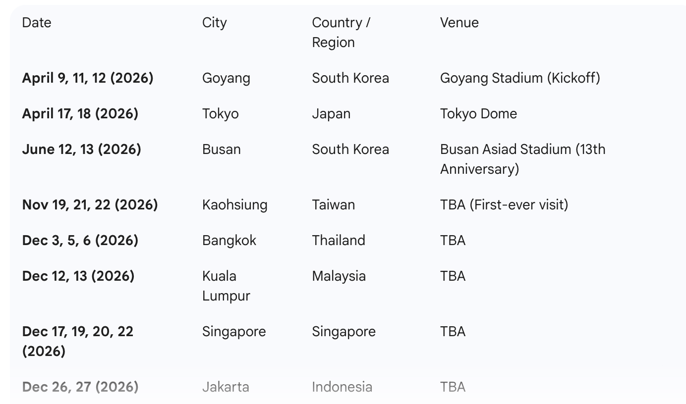 2026: BTS Asia Tour dates, hosts and venues