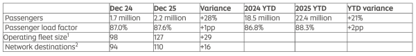 The airline closed the year on a high note, carrying 2.2 million passengers in December, up 28% compared with the same month in 2024. Passenger load factor for the month reached 87.6%, maintaining consistently high utilisation during the peak end-of-year travel period.