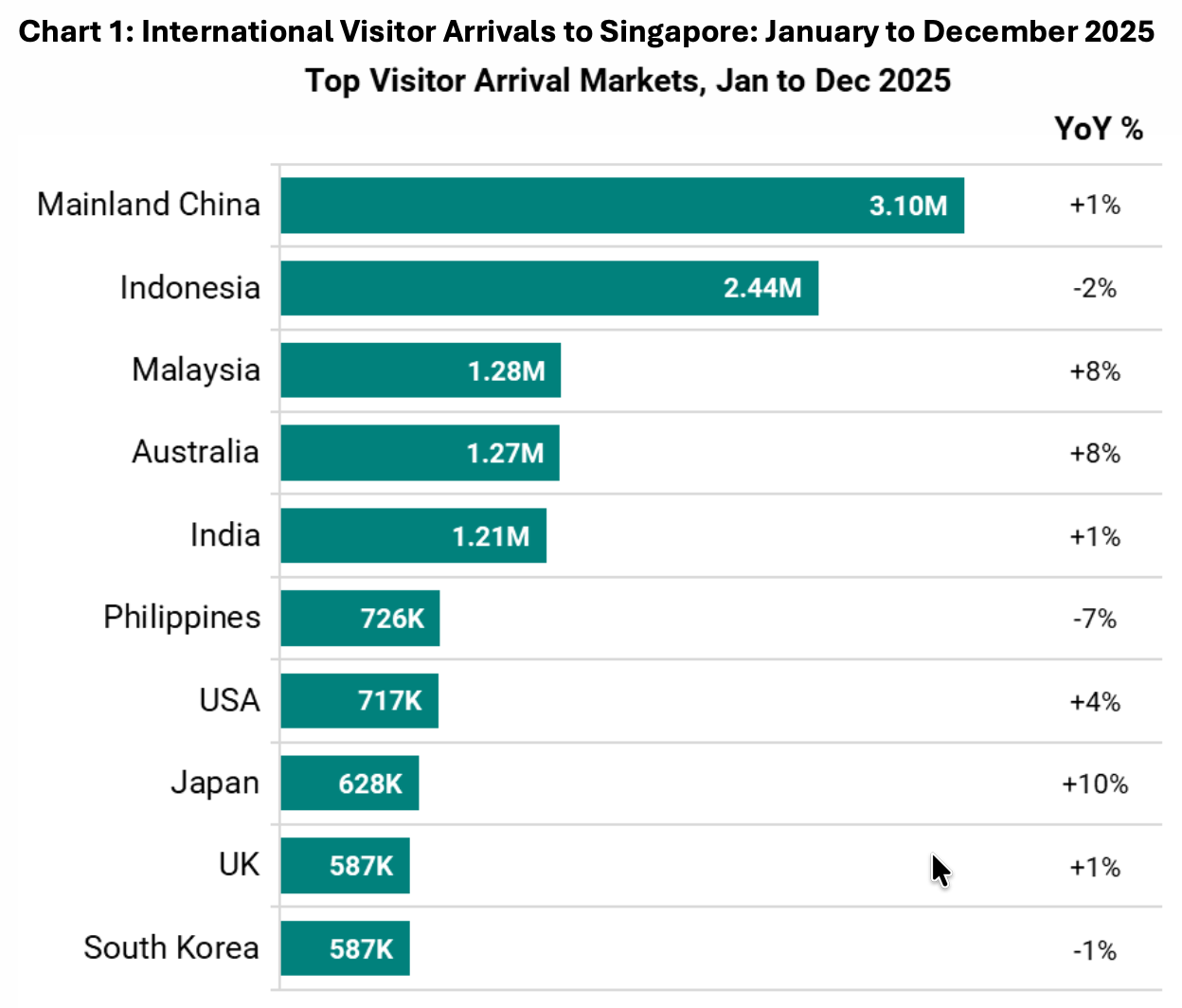 International visitor arrivals to Singapore in 2025 reached 16.9 million, up 2.3% from 2024, with Mainland China (3.1 million), Indonesia (2.4 million), Malaysia (1.3 million), Australia (1.3 million), and India (1.2 million) the top five markets.