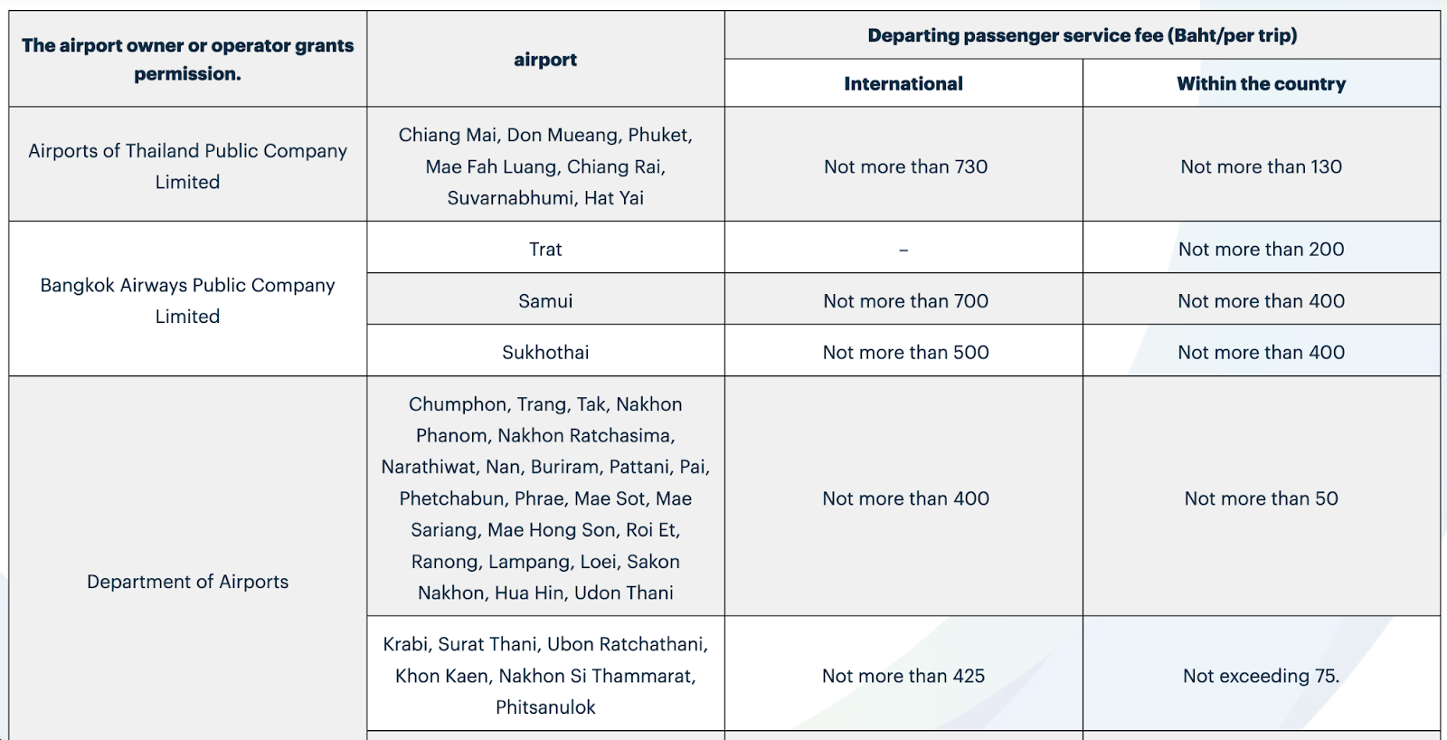 The PSC for domestic flights at AOT airports remains unchanged at THB130. However, the Department of Airports (DOA) received approval to raise domestic fees from THB50 to THB75 at its smaller regional airports in an earlier CAAT update.