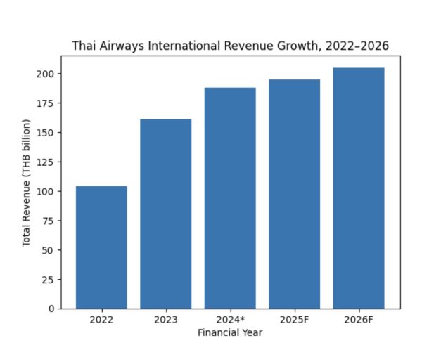 Between 2022 and 2024, Thai Airways transformed its financial trajectory. Revenue rose sharply from approximately THB 104 billion in 2022 to around THB 161 billion in 2023, before reaching an estimated THB 188 billion in 2024, a figure adjusted to exclude one-off rehabilitation accounting items. Analyst consensus forecasts point to continued, if more moderate, growth to roughly THB 195 billion in 2025 and THB 205 billion in 2026, reflecting capacity discipline and yield management rather than aggressive expansion.