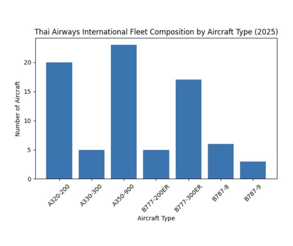 Fleet restructuring has been central to the airline’s improved cost base. By 2025, THAI presented a streamlined wide-body-centric fleet dominated by Airbus A350-900s and Boeing 777-300ERs for long-haul services, complemented by Boeing 787s for thinner intercontinental routes and Airbus A320s on regional sectors. Importantly, the airline has retired older, maintenance-intensive aircraft types, significantly reducing engineering complexity and spare-parts inventories.