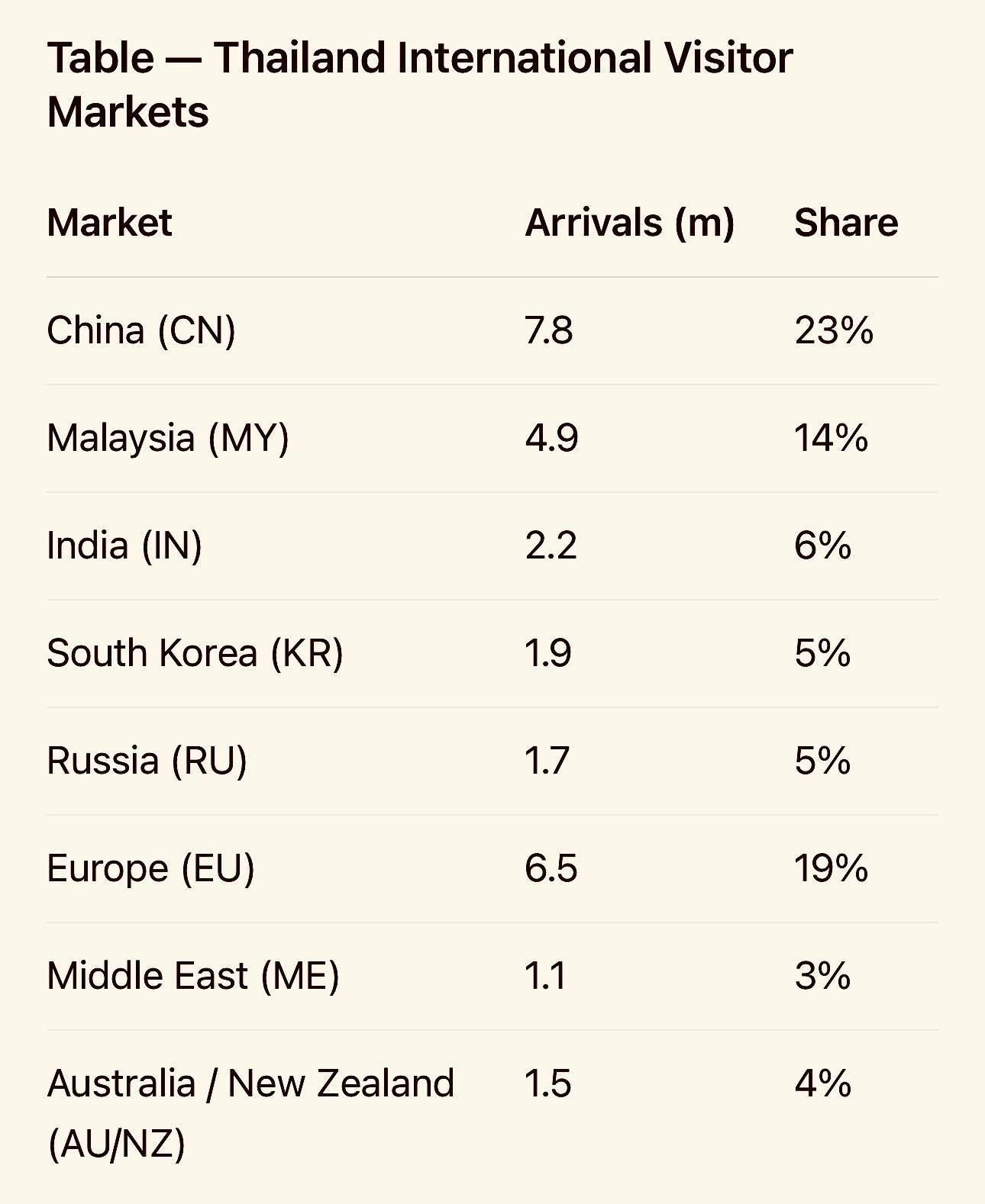 Thailand Tourism Exposure by Source Markets: China remains Thailand’s largest market, though Europe and India continue to grow.