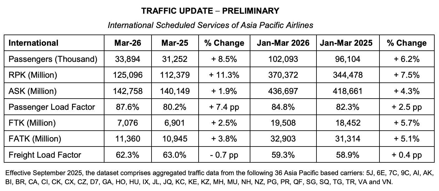 KUALA LUMPUR, 30 April 2026: Preliminary March 2026 traffic figures released on Tuesday by the Association of Asia Pacific Airlines (AAPA) showed robust growth in international passenger traffic, reflecting healthy travel demand.