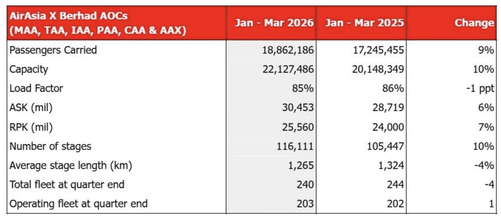 KUALA LUMPUR, 16 April 2026: AirAsia X Berhad has announced its preliminary operating statistics for the first quarter of 2026, carrying approximately 18.9 million passengers during the quarter, up by 9% year-on-year.