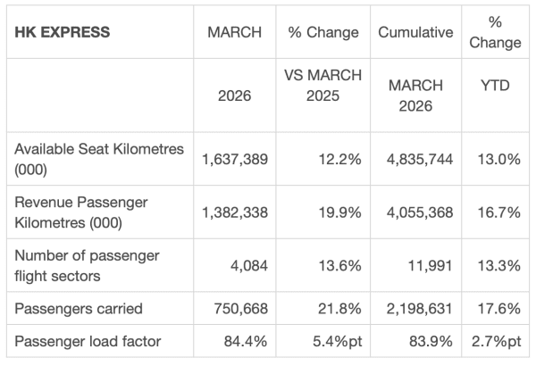 HK Express carried more than 750,000 passengers in March 2026, an increase of 22% year on year, while Available Seat Kilometres (ASKs) grew by 12%. In the first three months of 2026, passengers carried increased by 18% compared with the same period in 2025.