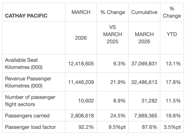 Cathay Pacific carried 24% more passengers in March 2026 compared with March 2025, while Available Seat Kilometres (ASKs) increased by 9%. In the first three months of 2026, the number of passengers carried increased by 20% compared with the same period in 2025.