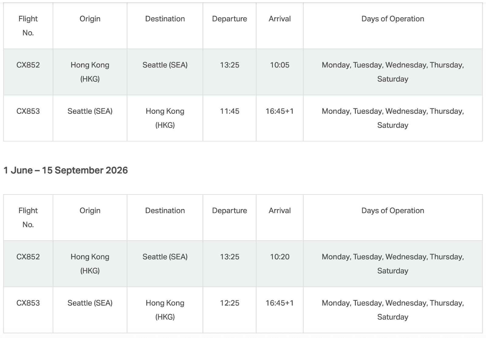 Cathay Pacific’s Hong Kong-Seattle service uses an Airbus A350-900 aircraft, configured with business class, premium economy, and economy cabins. Flight schedules are as follows: