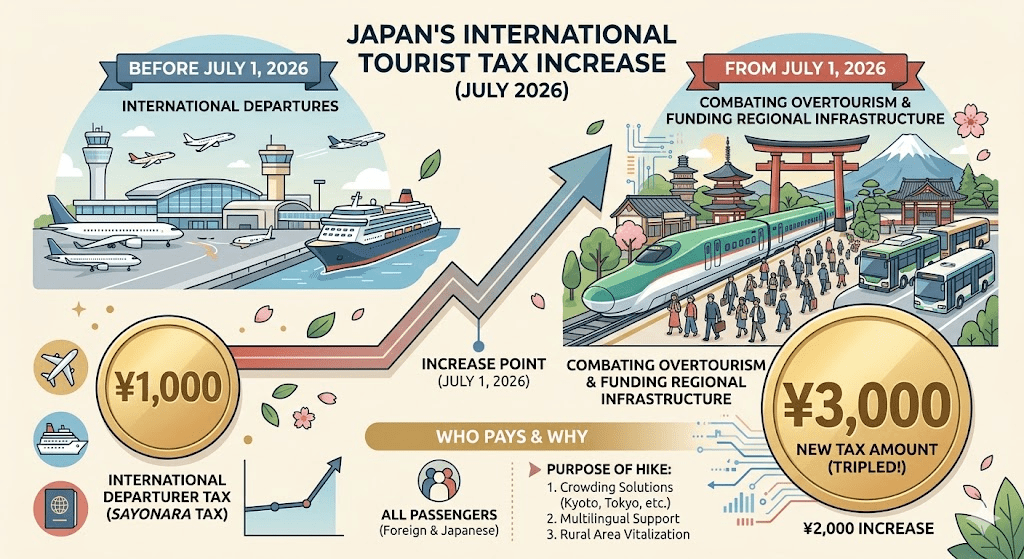 While the International Tourist Tax applies only to leaving the country, travellers pay an accommodation tax when staying in Japanese cities (Tokyo, Kyoto, Osaka, and, as of 1 April 2026, Hokkaido).