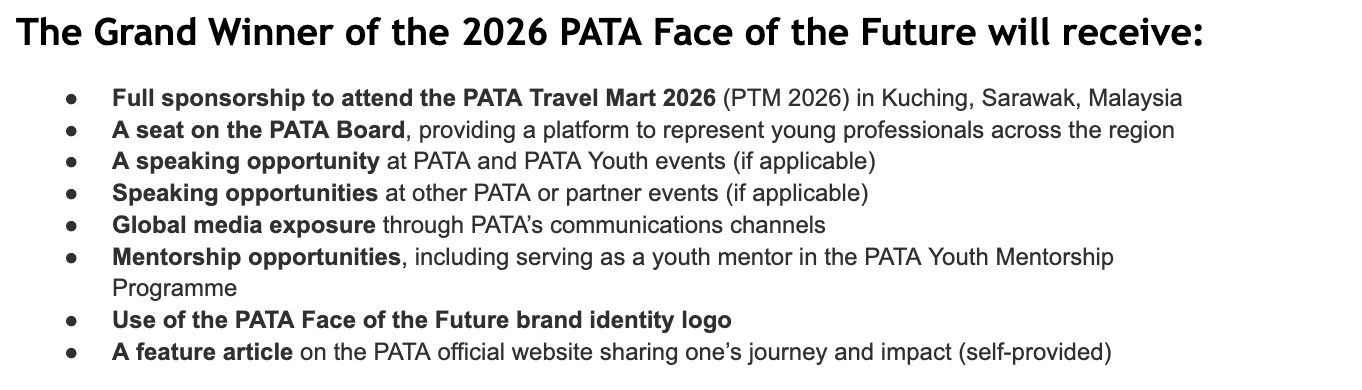 For full application details, eligibility requirements, and judging criteria, visit www.pata.org/pata-face-of-the-future-2026 or contact Nick Chun, PATA Manager of Membership & Youth Programme, at [email protected].
