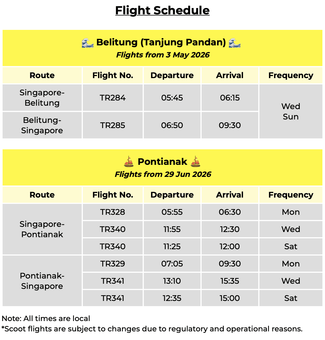 From 29 June 2026, Scoot will operate three weekly flights to Pontianak.