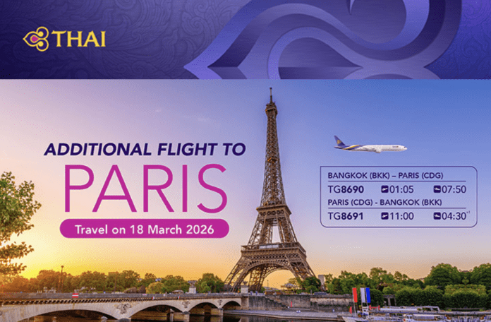 BANGKOK, 17 March 2026: Thai Airways International is adding a special round-trip flight between Bangkok and Paris on 18 March 2026 to help alleviate the situation of stranded passengers and meet increasing travel demand.